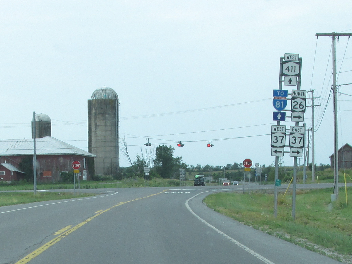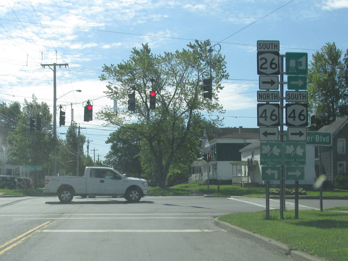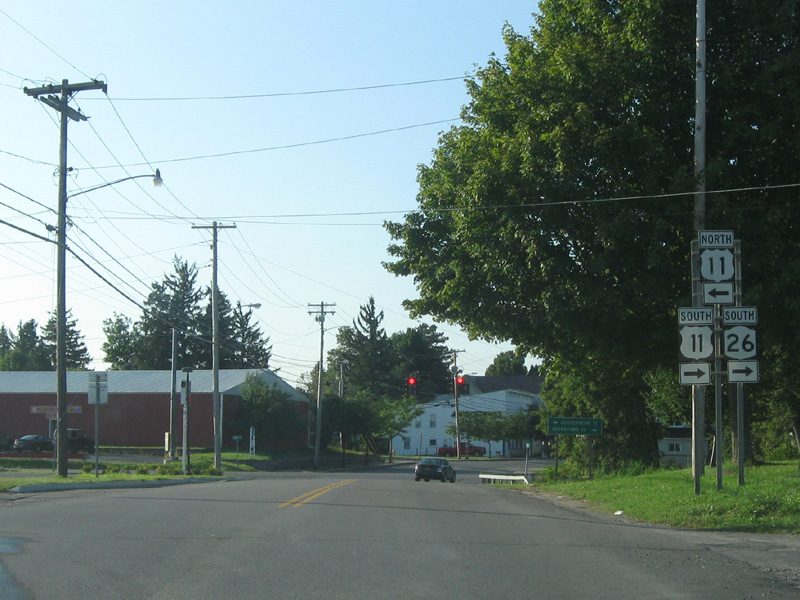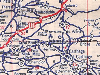 NY 26 pretty much follows its original course. However, the section between Carthage and Theresa had to be realigned to accomodate expansion of the Fort Drum Military Base in the mid 1950s. The original alignment in this area followed NY 3 from Carthage to North Wilna. The section from North Wilna and Antwerp was dismantled for the base. From Antwerp to Theresa, NY 26 followed present day Jefferson CR 194 before rejoining its present alignment.