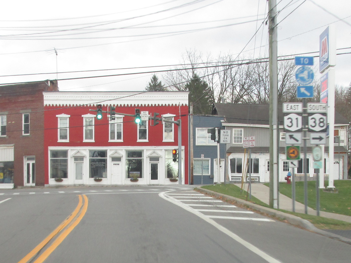 The southern terminus of NY 38 was originally located at the present NY 17/NY 96/NY 434 interchange. NY 38 was truncated to its present south end around 1980. |