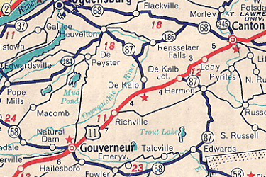 NY 87's original alignment began at NY 3 in Harrisville, Lewis County and followed Maple St., Stone Rd, and Pitcairn Rd. to St. Lawrence CR 24 near Pitcairn. After a brief wrong way overlap with NY 58 near Edwards, NY 87 continued north to Hermon and DeKalb via St. Lawrence CR 24, CR 17, US 11, and NY 812.