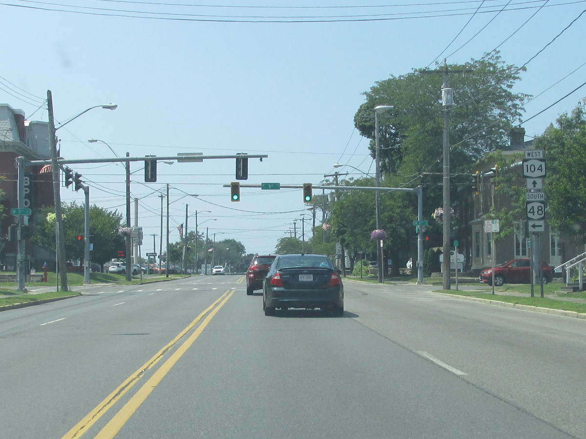 Eastbound NY 104 reassurance marker in downtown Oswego.
