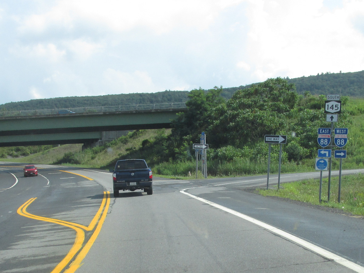 NY 145's original alignment was limited to the section between Cairo (NY 23) and Cooksburg (NY 81). In 1940, the route was extended south via NY 23 to the Rip Van Winkle Bridge near Catskill and north to its current northern terminus in Sharon (US 20). The overlap with NY 23 was eliminated in 1970 when NY 145 was truncated back to its original southern end. |