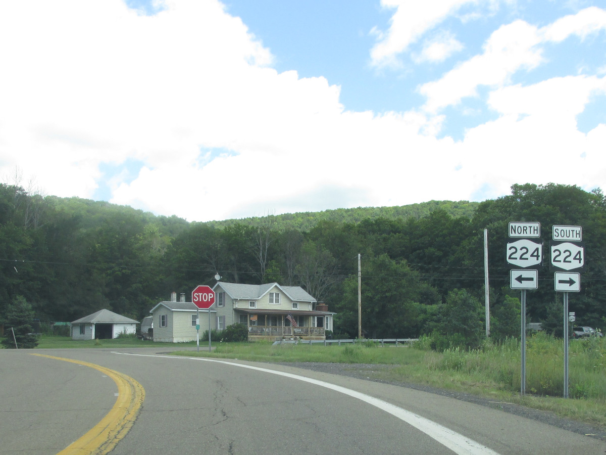 The original alignment of NY 223 extended east to Candor along the current NY 224, NY 34, and NY 96 alignments. NY 223 was truncated to its current eastern end in the 1950s. |